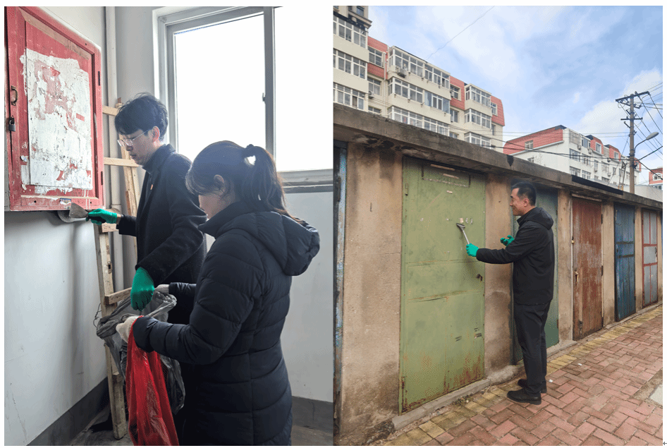 活動中,黨員志愿者們手持鏟刀、掃帚、夾等工具,分組穿梭于樓宇間,耐心細致地對社區(qū)內(nèi)墻面、扶梯、線桿、公告欄等公共設(shè)施上的非法張貼物實施專項清理。