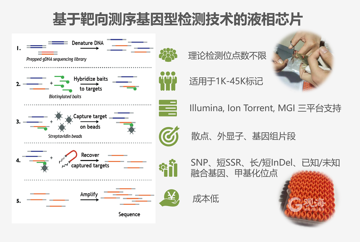 液相基因芯片,將原本需要通過光刻技術(shù)固定在硅片上的數(shù)萬種生物探針濃縮在一個(gè)小液滴里,實(shí)現(xiàn)DNA分子的靶向捕獲,并獲取DNA序列信息。液相芯片國(guó)內(nèi)擁有自主知識(shí)產(chǎn)權(quán),打破國(guó)外技術(shù)壟斷,是育種用得上、用得起、用得好的技術(shù),使基因型檢測(cè)不再成為中國(guó)分子育種的技術(shù)瓶頸,成為高通量、大規(guī)模、超低成本的基因型檢測(cè)中國(guó)“芯”?;蛐酒赏瑫r(shí)對(duì)大量基因和遺傳信息進(jìn)行快速精準(zhǔn)的檢測(cè)和分析,是提升育種效率、培育抗病、抗逆及優(yōu)質(zhì)等新品種的重要分子工具。