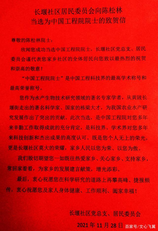 2021年11月28日武漢黃陂家鄉(xiāng)祝賀陳松林當(dāng)選中國工程院院士,陳院士回復(fù):“當(dāng)選院士更多的是一份責(zé)任,現(xiàn)在趕上我們國家打好種業(yè)‘翻身仗’的大好時機(jī),讓我感覺到今后肩上的擔(dān)子更重了。同時感恩家鄉(xiāng)父老的關(guān)愛,并盡力反饋家鄉(xiāng)!”陳松林博士是破譯我國首個魚類基因組的中國水產(chǎn)科學(xué)研究院水產(chǎn)生物技術(shù)領(lǐng)域首席科學(xué)家。我們相識的機(jī)緣是經(jīng)其姐夫胡炳基先生介紹,后將其主要成果收入《黃陂春秋﹒人物卷》《無陂不成鎮(zhèn)》人物卷