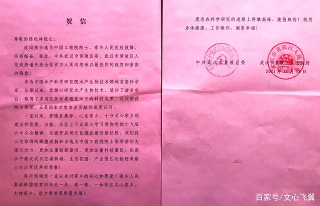 黃陂區(qū)委、區(qū)政府致陳院士賀信