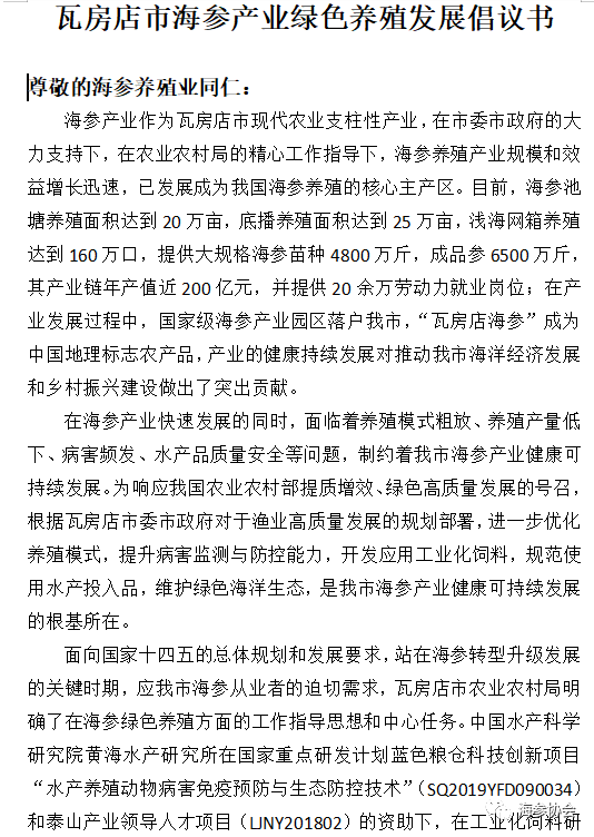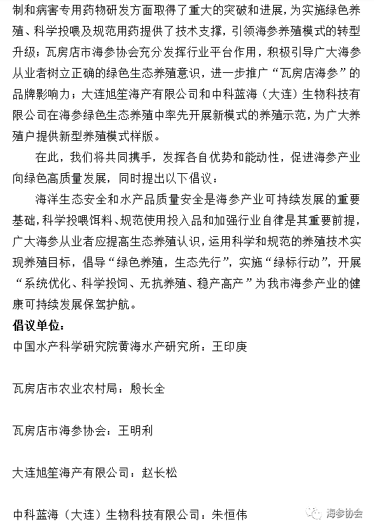 2月28日,由中國水產(chǎn)科學(xué)研究所、瓦房店市農(nóng)業(yè)農(nóng)村局、瓦房店市海參協(xié)會、大連旭笙海產(chǎn)有限公司、中科藍(lán)海(大連)生物科技有限公司等多家涉海養(yǎng)殖單位,在位于遼刺參主產(chǎn)區(qū)的瓦房店市謝屯鎮(zhèn)沙山村的旭笙海產(chǎn)公司共同發(fā)起倡議,實施中國水產(chǎn)科學(xué)研究院黃海水產(chǎn)研究所重點研發(fā)“藍(lán)色糧倉”科技創(chuàng)新項目“水產(chǎn)養(yǎng)殖動物病害免疫預(yù)防與生態(tài)防控技術(shù)”(sq2019yfd090034)和泰山產(chǎn)業(yè)領(lǐng)導(dǎo)人才項目(LjNY201802)下的工業(yè)化飼料研制和病害專用藥物研發(fā),以科學(xué)投喂和規(guī)范用藥引領(lǐng)傳統(tǒng)海參養(yǎng)殖模式的轉(zhuǎn)型升級,從海洋生態(tài)安全和水產(chǎn)品質(zhì)量安全的高度,倡導(dǎo)“綠色養(yǎng)殖,生態(tài)先行”的養(yǎng)殖新模式,以科學(xué)手段和技術(shù)支撐,促進(jìn)遼刺參主產(chǎn)區(qū)養(yǎng)殖業(yè)轉(zhuǎn)型升級,提質(zhì)增效。