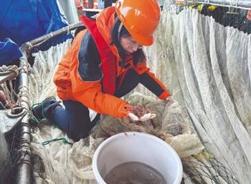 1月29日下午,中國第40次南極考察南極半島鄰近海域大洋調查,最后一個站點的磷蝦拖網被收回“雪龍”號艉甲板。考察隊員趙云霞解開拖網末端綁扎的繩索,將網中的磷蝦倒入盛有海水的取樣桶中——收獲頗豐,這次獲得的樣品數量目測在1000尾以上。