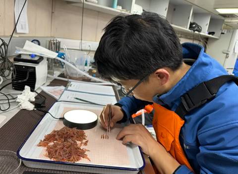 將樣品帶回實驗室后,趙云霞和同樣來自中國水產科學研究院黃海水產研究所的隊友王新良,抓緊時間分類處理磷蝦樣品。他們主要負責此次南極重點海域的磷蝦調查工作。