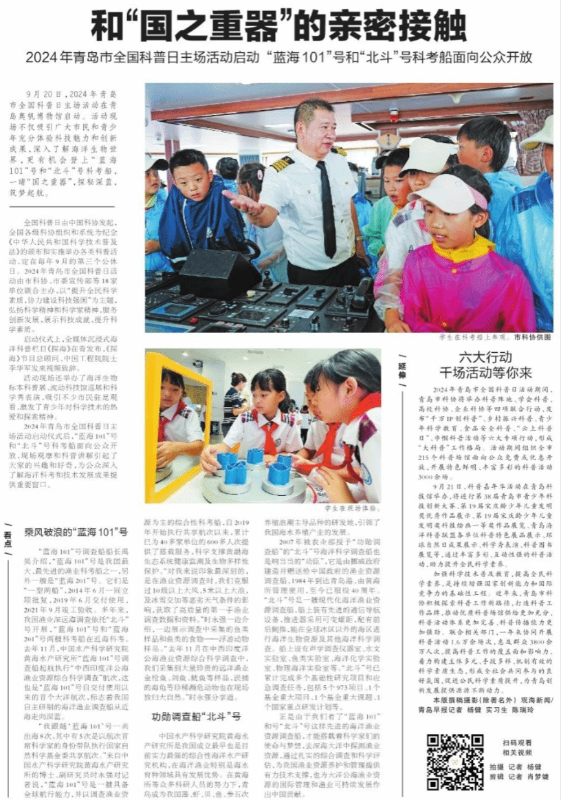2024年青島市全國科普日主場活動(dòng)啟動(dòng)儀式后,“藍(lán)海101”號(hào)和“北斗”號(hào)科考船面向公眾開放,現(xiàn)場觀摩和科普講解引起了大家的興趣和好奇,為公眾深入了解海洋科考和技術(shù)發(fā)展成果提供重要窗口。