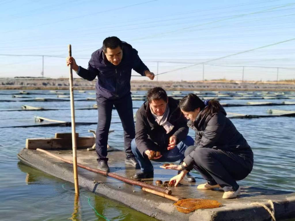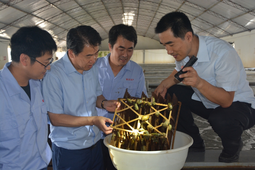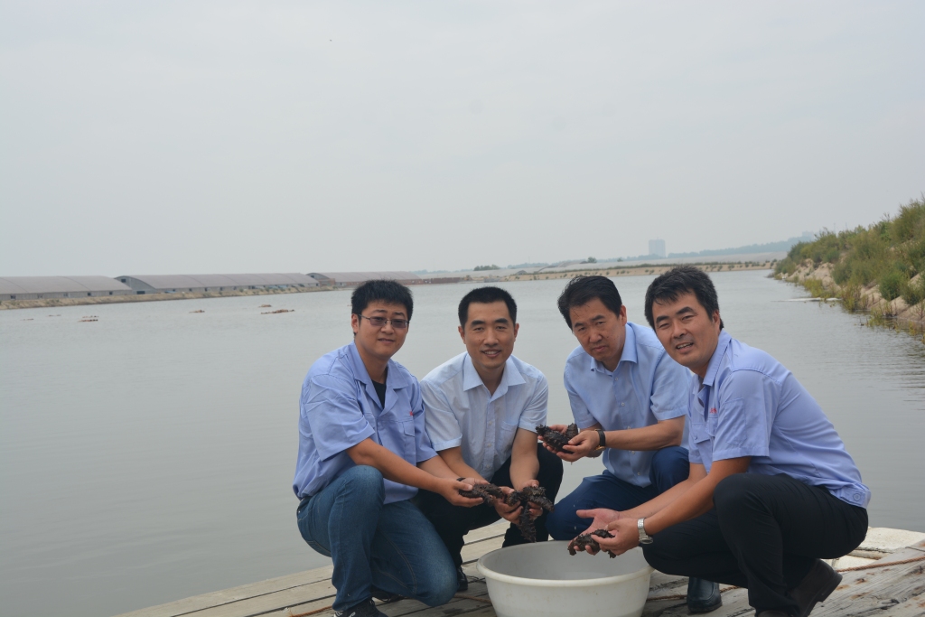 初春時節(jié),王印庚(右二)在東營觀測海參新品種試養(yǎng)情況