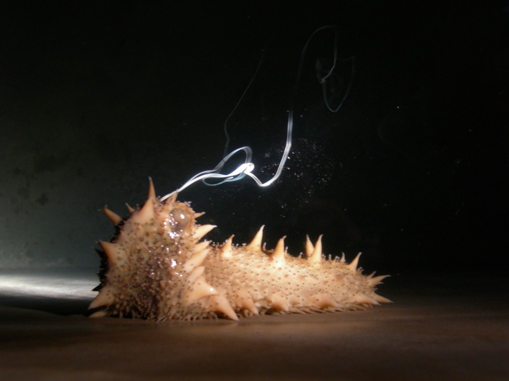 一頭雄性海參在水中排出精子的瞬間