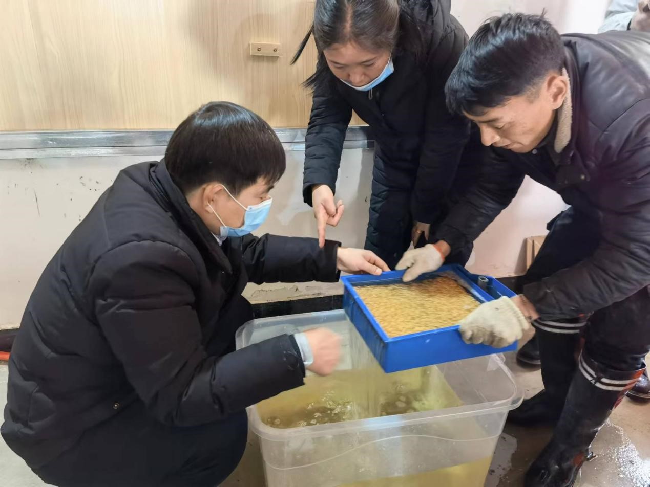 劉長琳博士指導當?shù)丶夹g人員進行魚卵消毒
