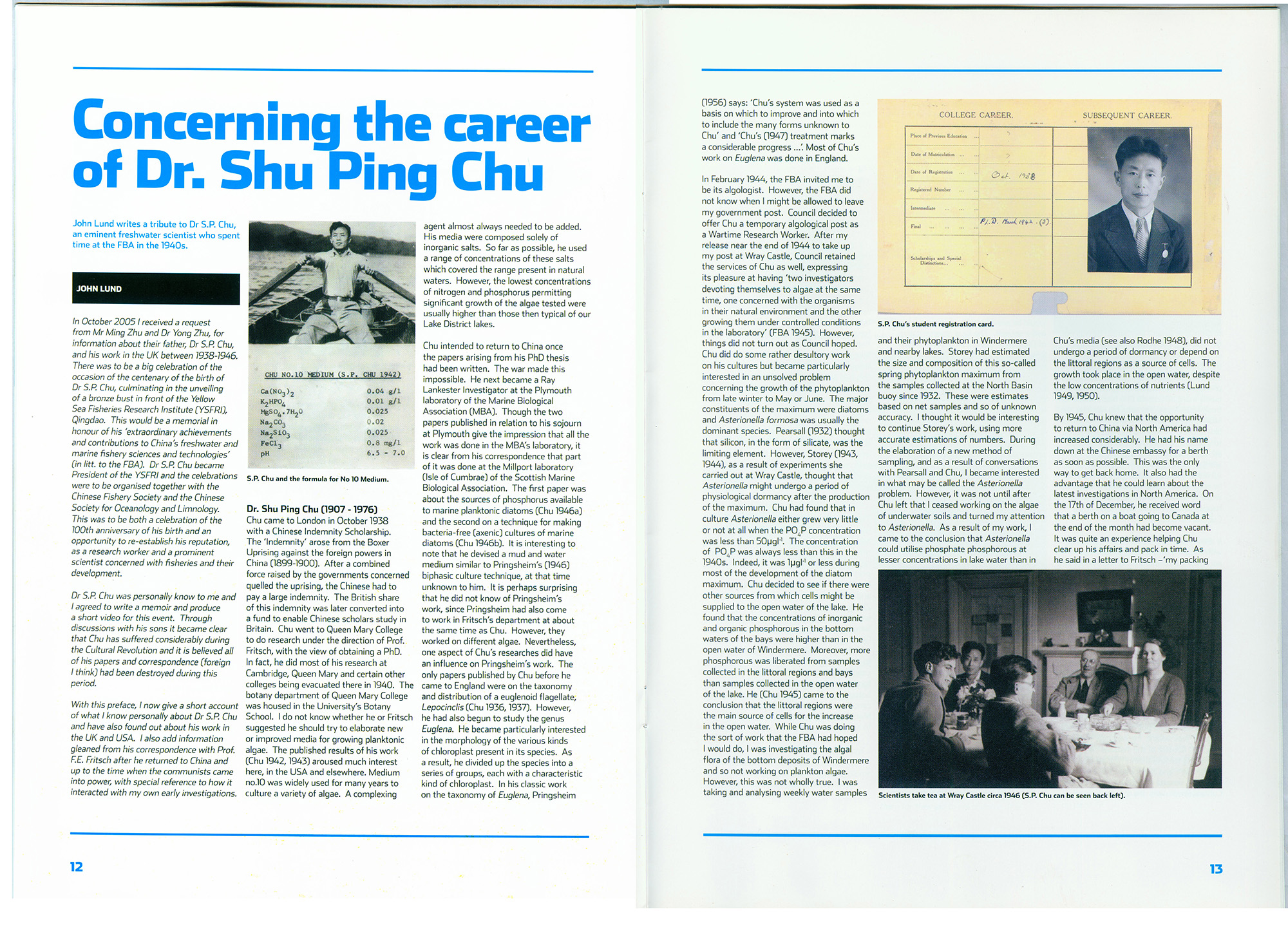 圖片上方為朱樹屏在英國溫德米爾湖中工作,下方為“朱10”配方。此配方照片至今仍展示在英國淡水生物學(xué)會的辦公室里。